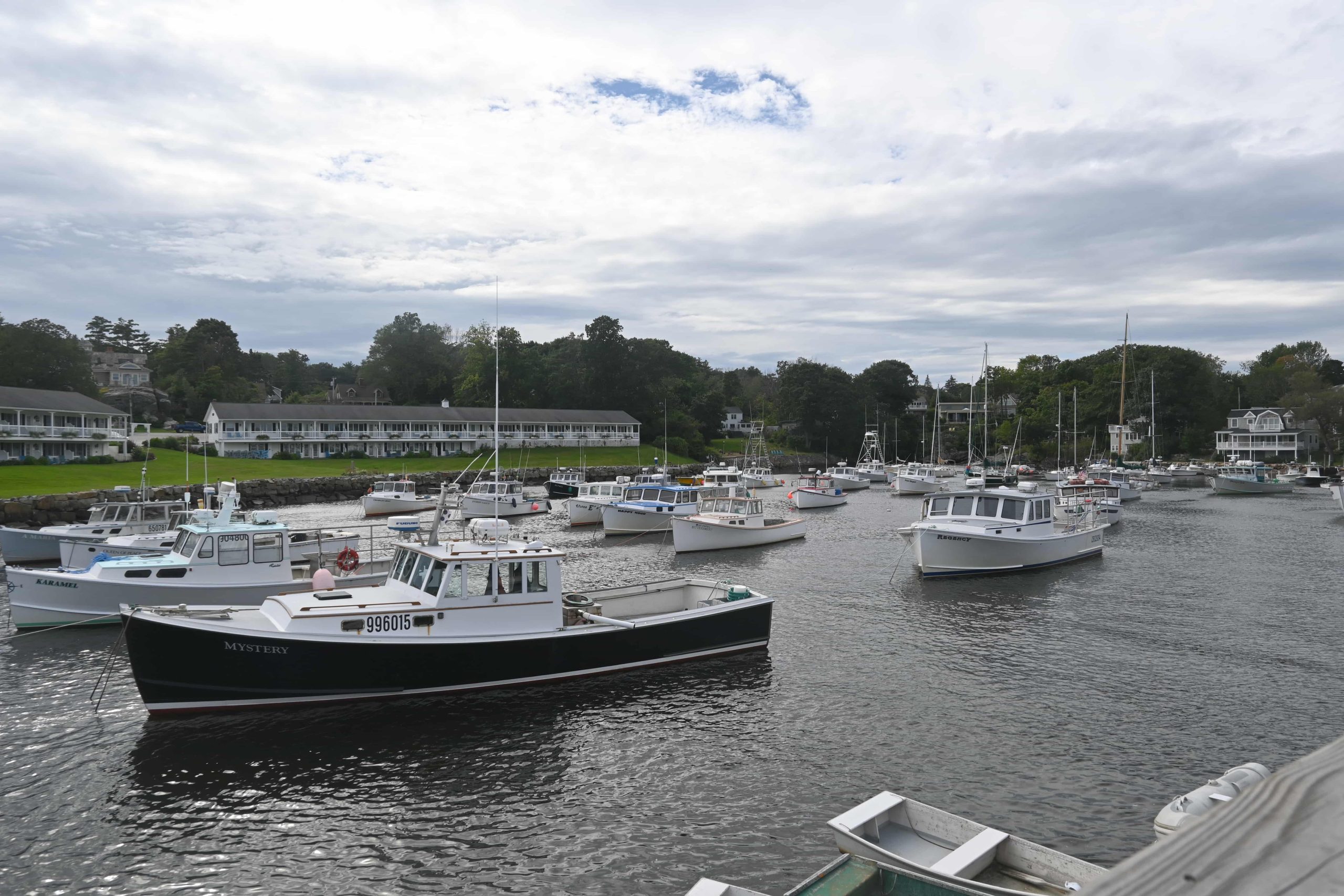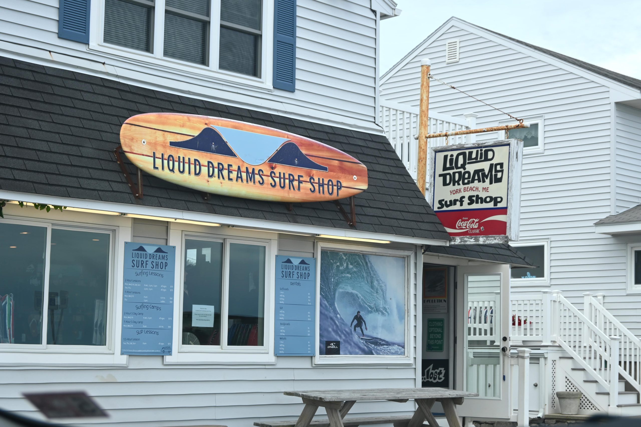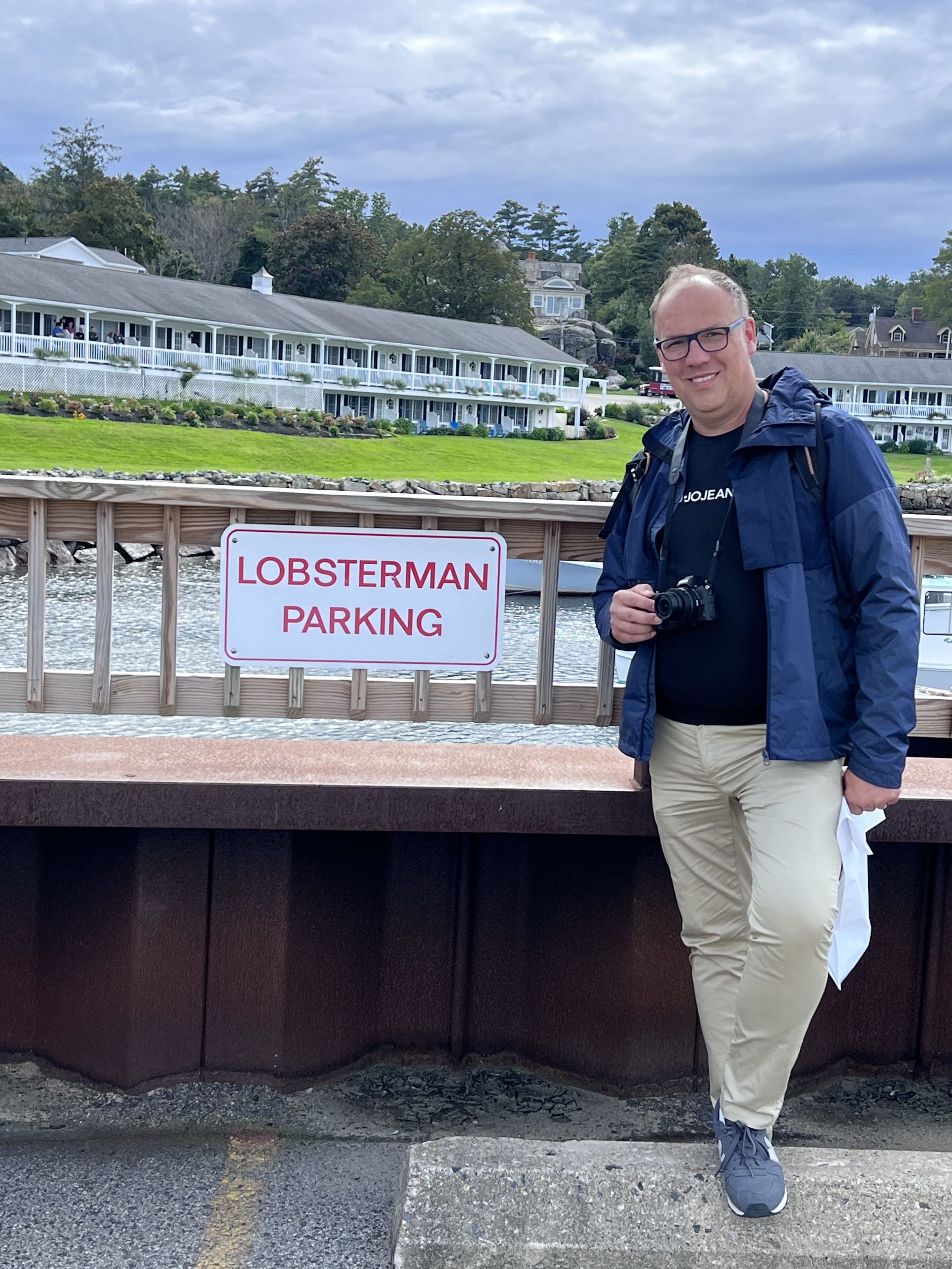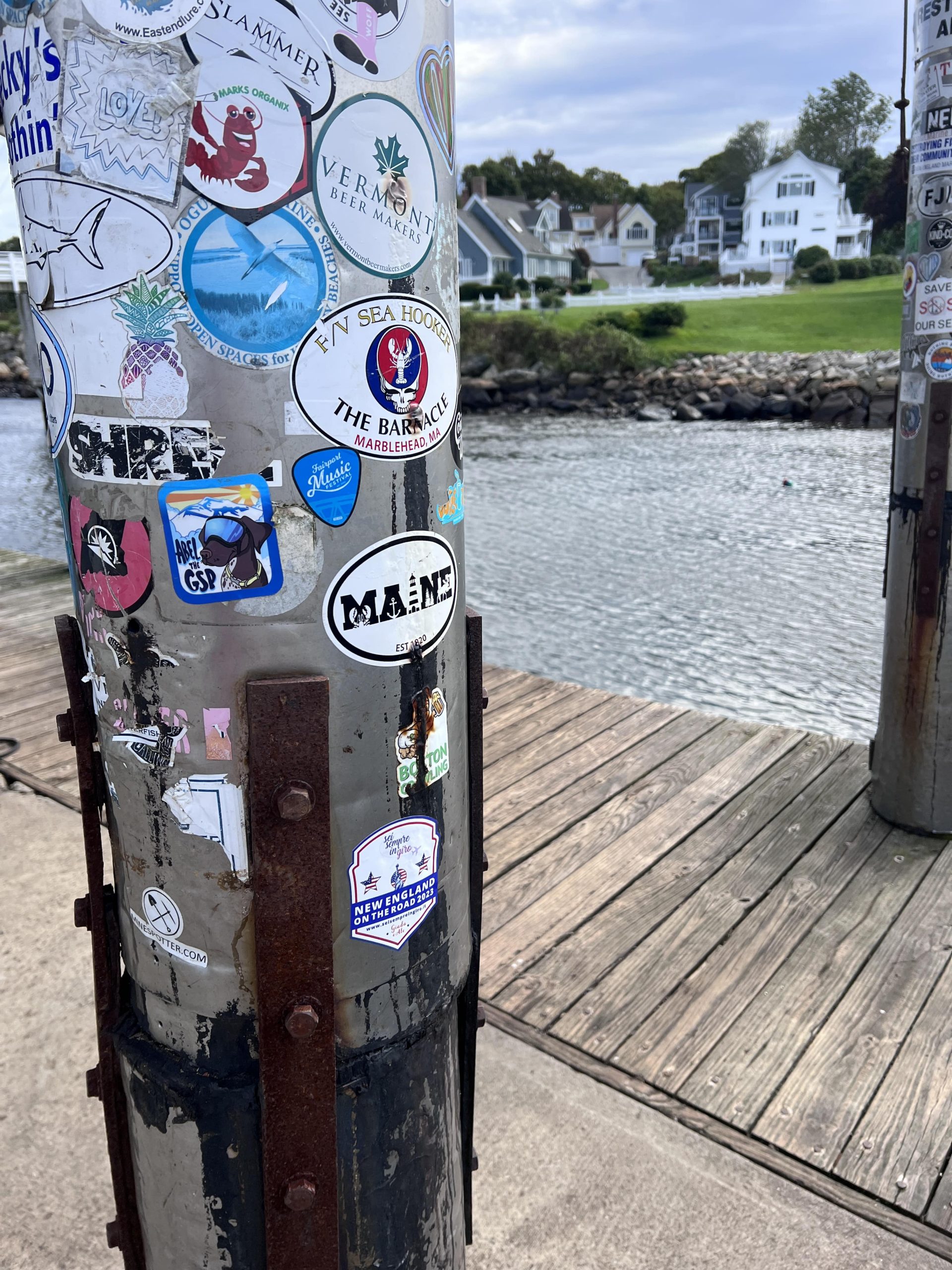 Dopo Kittery, cominciamo il nostro tour tra villaggi di pescatori e fari: si comincia con gli Yorks – York Village e York Beach, con il lungomare bloccato perché tutti si fermano a fare foto al mare in “tempesta” (onde abbastanza alte, che fanno la felicità dei numerosi surfisti giunti per l’occasione fin dal Canada), per proseguire fino al famoso Nubble Lighthouse, a Cape Neddick: bellissimo e affollatissimo per lo stesso motivo di York Beach, giriamo un po’ in tondo nel parcheggio aspettando che si liberi un posto e quando lo troviamo ce lo teniamo per un po’, facendo mille foto e video al faro e al mare e fermandoci anche a pranzare al Fox’s Lobster House, uno shack proprio là vicino, dove mangiamo una clam chowder divina (non mi stancherò mai di mangiare questa fantastica zuppa di vongole e patate) e un lobster roll in due, seduti sui tavolini all’esterno vista faro. Il vento comincia ad aumentare (ma c’è sempre il sole), così riprendiamo la macchina e proseguiamo per Ogunquit: poco prima dell’abitato ci fermiamo nel grazioso villaggetto sul porticciolo di Perkins Cove, dove facciamo un giretto tra i negozietti, compriamo la calamita del Maine e ci godiamo l’atmosfera (il posto è simile a Bearskin Neck a Rockport visto ieri, ma con il sole è tutta un’altra cosa!). Anche qui altro sticker attaccato!