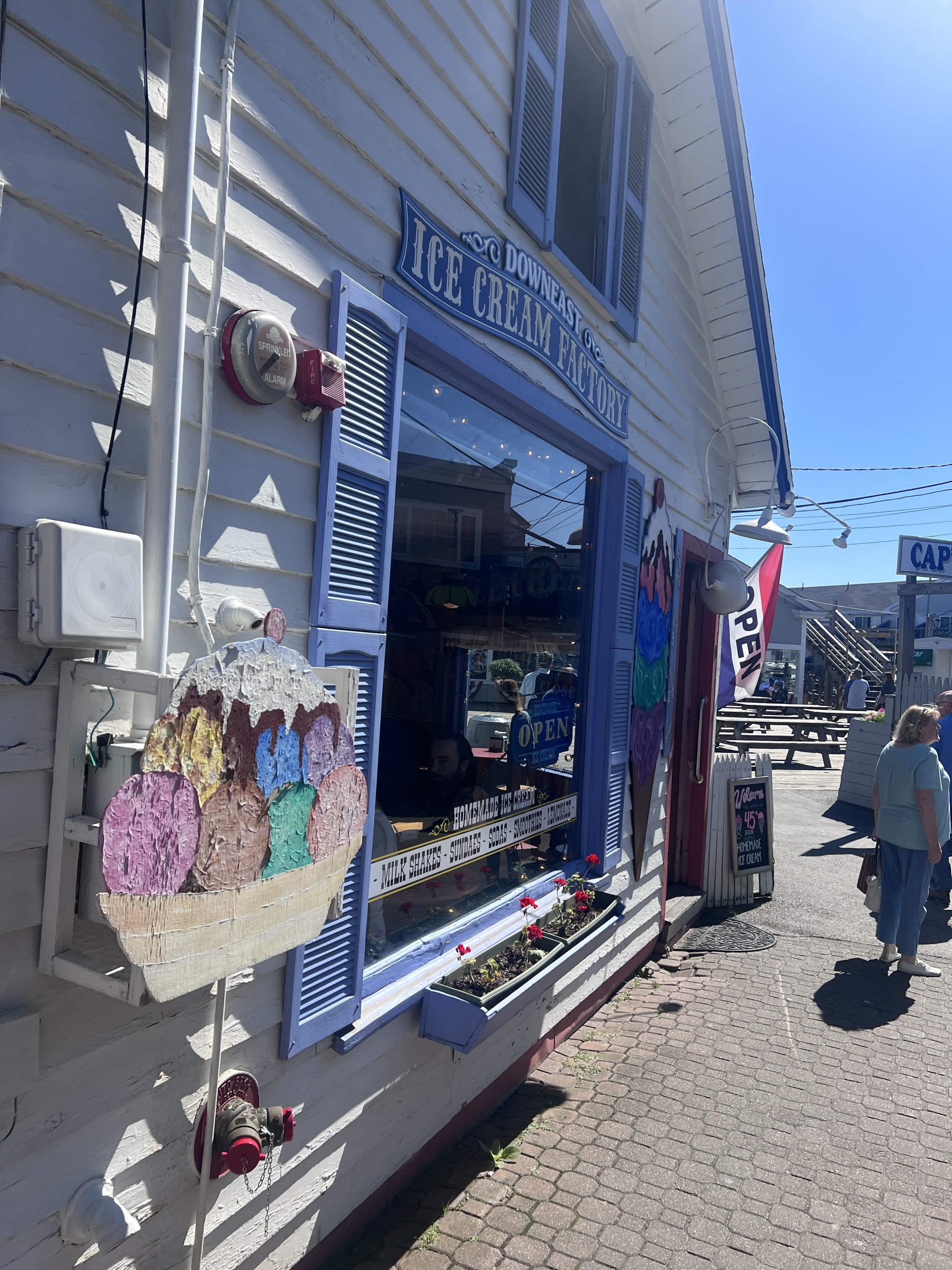 Boothbah Harbor è un gioiellino, pieno di negozietti colorati, gallerie d’arte, negozi di gift particolari, ristorantini. La parte centrale ricorda molto Fisherman’s Wharf a San Francisco, ma è più piccola e autentica. Ci fermiamo a prendere un home made fudge che mangeremo per merenda, e riprendiamo la macchina al solo scopo di andare dall’altra parte dell’insenatura a mangiare da Boothbay Lobster Wharf, un lobster shack gestito dalla cooperativa di pescatori locali (e infatti è vicino alla pescheria) con una deliziosa terrazza sul porticciolo. Prendiamo due clam chowder piccole (cup, non bowl), un fried clam roll (panino con vongole fritte) e un shrimp roll (panino con gamberetti fritti) e ce li gustiamo al sole, sul tavolino affacciato sul porticciolo, con anche la musica dal vivo (una coppia che ci delizia con i classici di John Denver e Johnny Cash, un po’ come avviene la sera da Big John’s Texas BBQ a Page)… l’atmosfera è PERFETTA. Sono questi i momenti meravigliosi che ci porteremo a casa dal New England <3