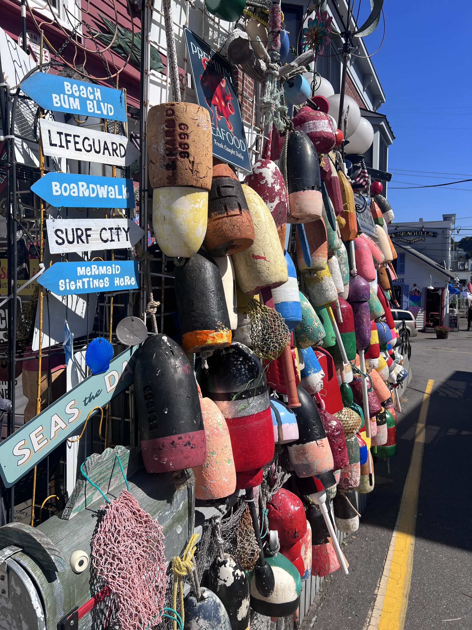 Ci rimettiamo in macchina, destinazione Boothbay Harbor… e stavolta sì che ci vengono gli occhi a cuoricino! Villaggetto posto su un porticciolo, con un lungo ponte pedonale in legno che conduce sull’altra riva dell’insenatura – la costa del Maine, in questo tratto, è un vero labirinto arzigogolato, quindi per ogni tappa bisogna percorrere in su e in giù dalla Route 1, la strada principale, una deviazione di almeno un’ora, ma ne vale la pena! Pensate che, se la srotolassimo, la costa del Maine sarebbe lunga 6000km.
