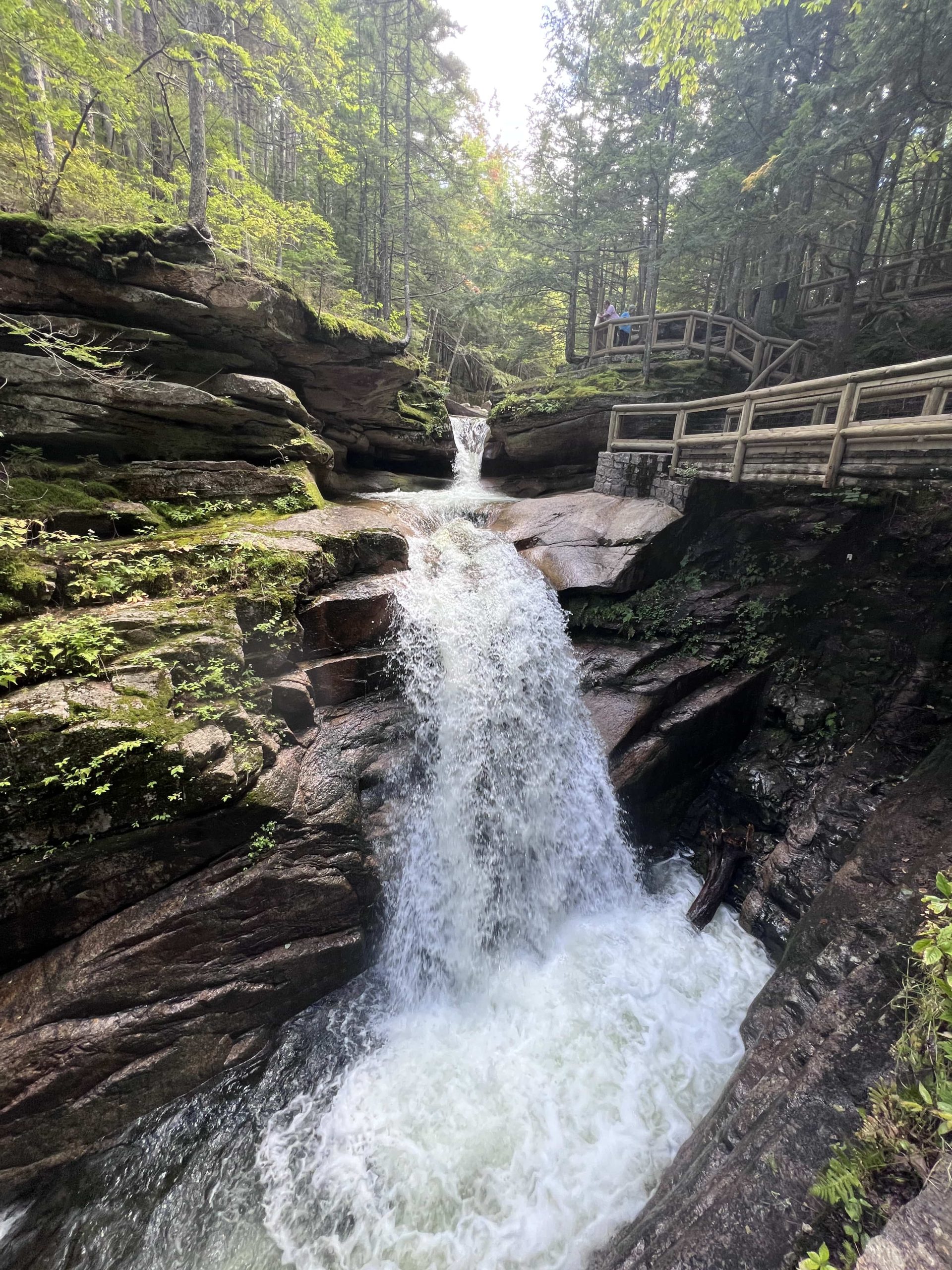 Lo scherzetto dell’olio ci ha portato via un bel po’ di tempo, quindi i nostri programmi di oggi saltano parzialmente: imbocchiamo nuovamente la Kancamagus Hwy per vedere i viewpoint saltati ieri con il sole, e facciamo anche un piccolo trail che porta alle Sabbaday Falls, bellissime cascate piene d’acqua. Non c’è tempo ahimè per il trail di Flume Gorge, ci facciamo bastare le cascate.