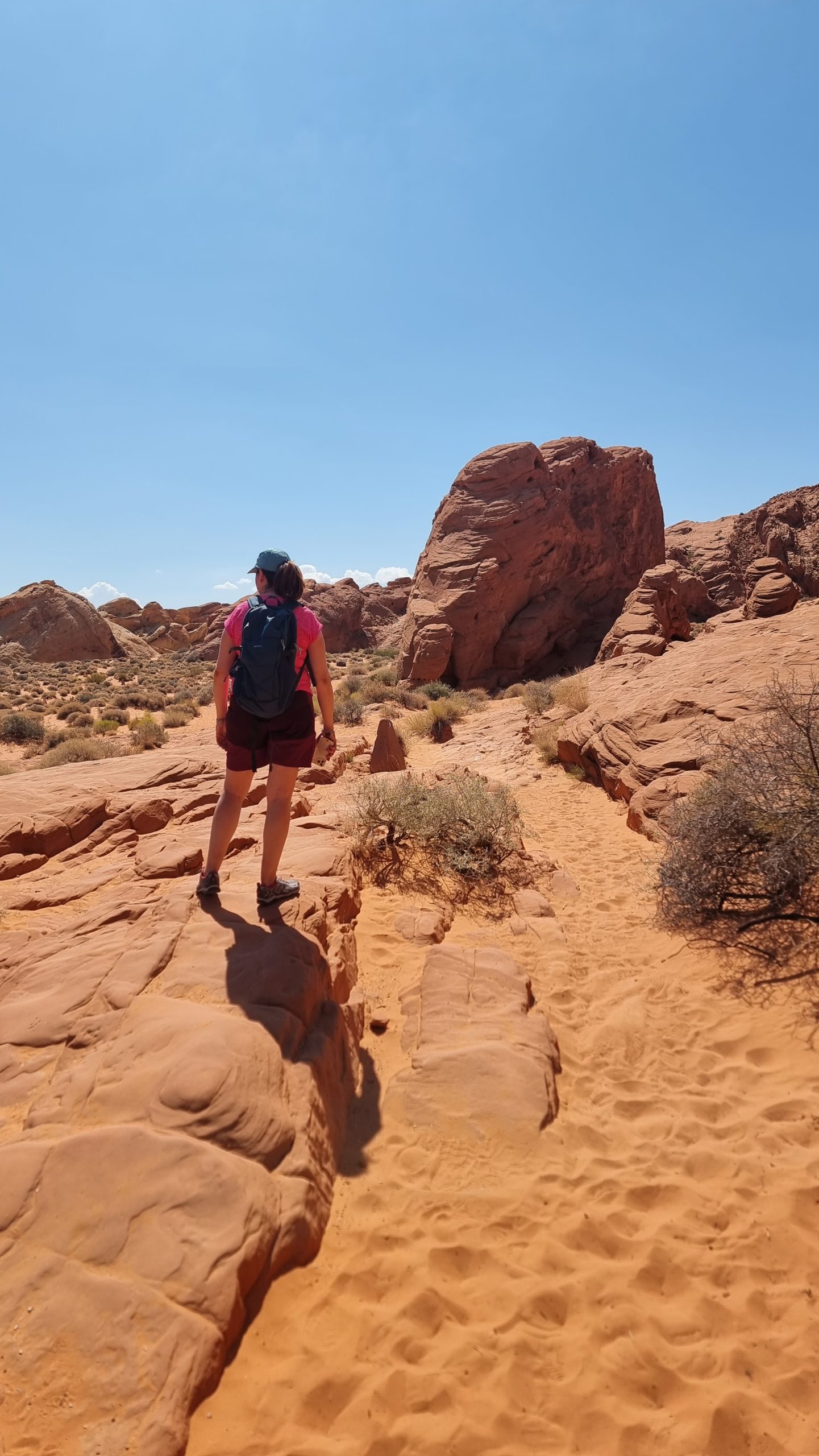 Dopo la Elephant Rock proseguiamo lungo la strada – meravigliosa – fino al Visitor Center, che si trova all’inizio della scenic drive del parco, una strada a fondo cieco che definire imperdibile è un eufemismo. Durante i mesi più caldi i trail principali della Valley of Fire sono chiusi per il caldo, ma veramente vale la pena visitare questo parco anche solo per percorrere la scenic drive. Al Visitor Center compriamo la calamita e finalmente qualcosa da mangiare – la nostra colazione oggi è stata uno Snickers e un pacchetto di Ritz – e poco dopo l’inizio della Scenic Drive scegliamo di fare il piccolo trail (1 miglio andata e ritorno) per arrivare a Rainbow Point. Anche qui quasi muoio. Che caldo, ragazzi, ma soprattutto quanta sabbia da scalare (finita tutta nelle scarpe e nelle calze, ovviamente).
